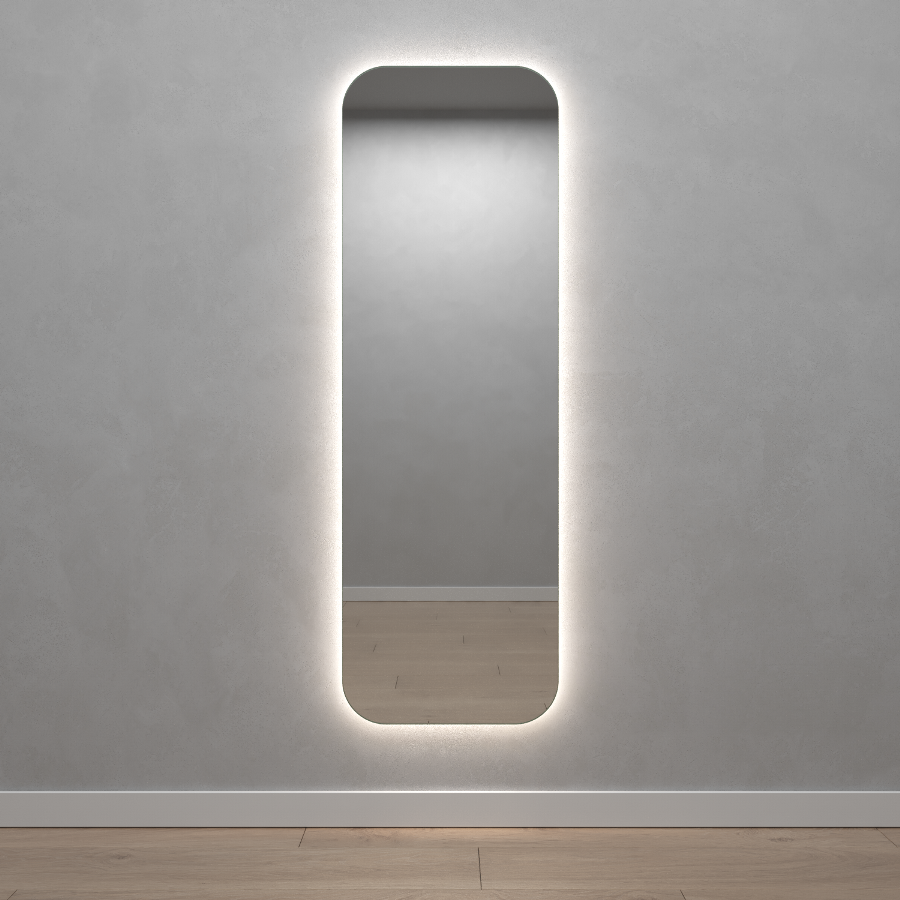Безрамное зеркало прямоугольной формы с контурной (тыльной) нейтральной подсветкой, свет 4000К. Подложка из высококачественного МДФ, светодиодная лента защищена матовым свето-рассеивателем от попадания пыли и влаги. Есть вывод 220W для подключения к сети, включение подсветки от выключателя на стене, либо от розетки.